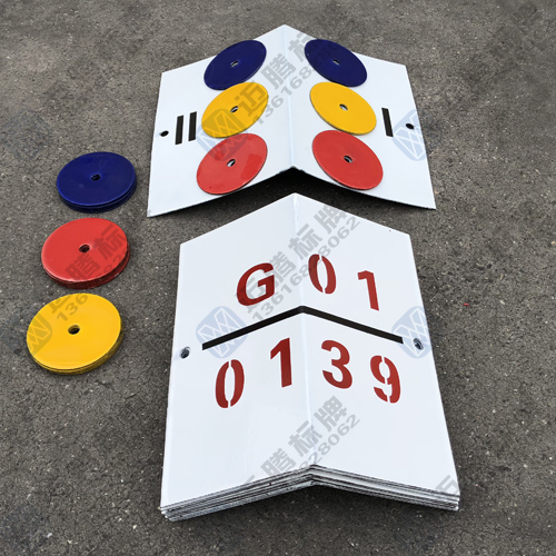 3 六口井线路标识牌 "标识牌长宽300×300mm,标识牌表面不带弧度,厚1.2mm,120度折弯(向里折),搪瓷表面。字用金属蚀刻来写,字体使用“ ARIAL”,高度为50mm,白底红字,分隔线黑色8mm厚,标识牌使用合成搪瓷工艺进行处理。