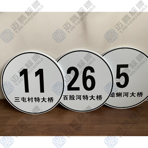墩台标识采用圆形铝合金标牌,直径400mm,厚度不小于1mm;白底黑字,自高150mm,字宽75mm,字凸出于标牌,字居中